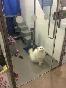 Battersean kissalassa kävi vilske. Katteja oli satakunta, jokainen omassa loossissaan. Muutamat työntekijät olivat leikkimässä kissojen kanssa tai vain silittelemässä niitä. Vapaaehtoiset järjestävät kissalassa usein neulomistempauksia viettäen samalla aikaa kodinetsijöiden kanssa. Pirteitä neuletöitä näkyikin täällä runsaasti.